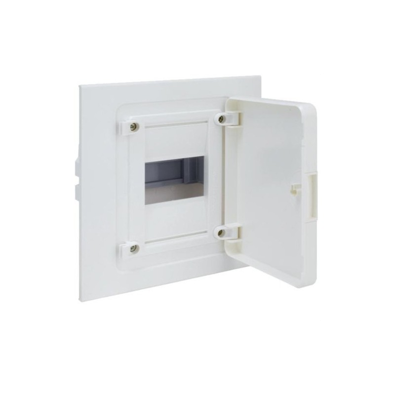 Caja de distribución de la gama Golf serie VF/VS con capacidad para 4 módulos en una fila, suministrada con puerta opaca blanca con apertura de 180 grados, regleta, chasis y sujetacables. El conjunto mantiene resistencia al hilo incandescente de 650°C, grado de protección IP40 y resistencia IK07, así como certificación AENOR y cumplimiento de RoHS y WEEE. La gama Golf serie VF/VS está disponible tanto en configuración para empotrar como para superficie, manteniendo compatibilidad modular y uniformidad técnica para aplicaciones de distribución eléctrica.