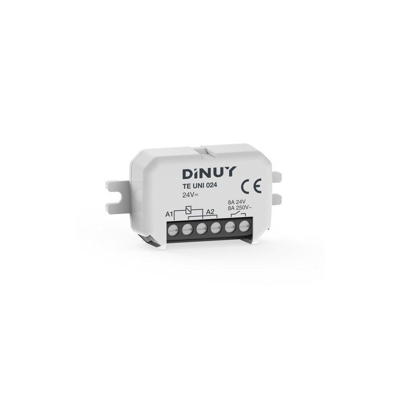 Telerruptor unipolar compacto de DINUY con capacidad de 1x8A, esencial para sistemas de seguridad y automatización que operan a 24V.