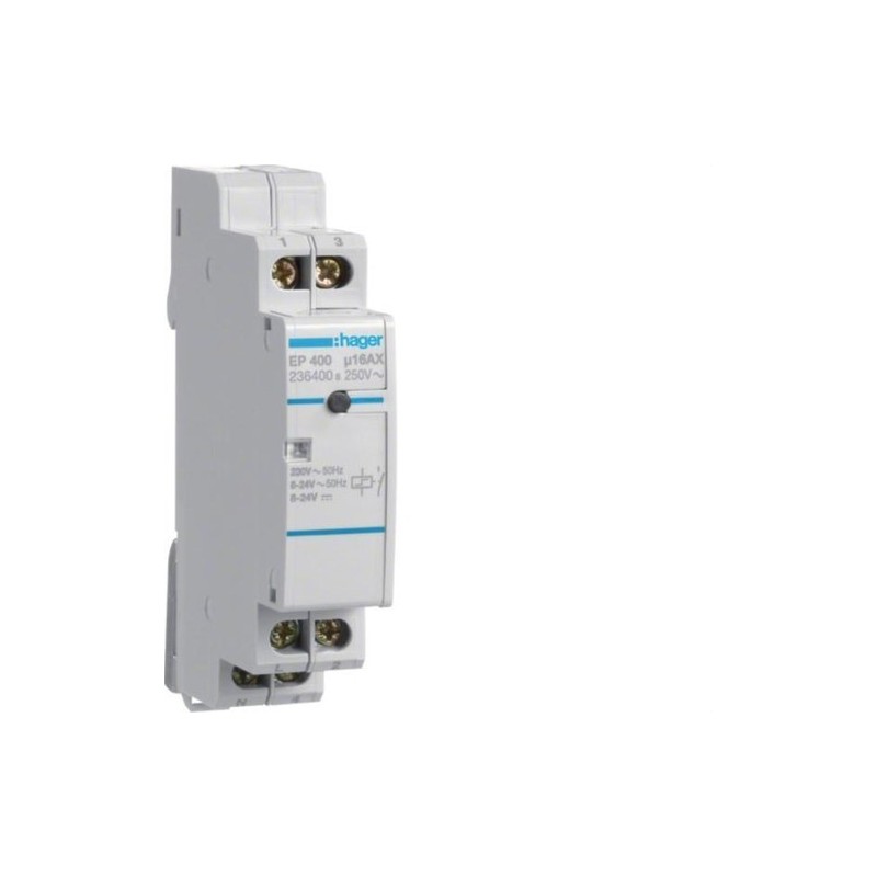 Telerruptor electrónico multitensión HAGER EP400. 1 contacto NA, 16A. Apto para bobinas de 8-24V AC/DC y conmutación a 250V. Ideal para instalaciones avanzadas y silenciosas.