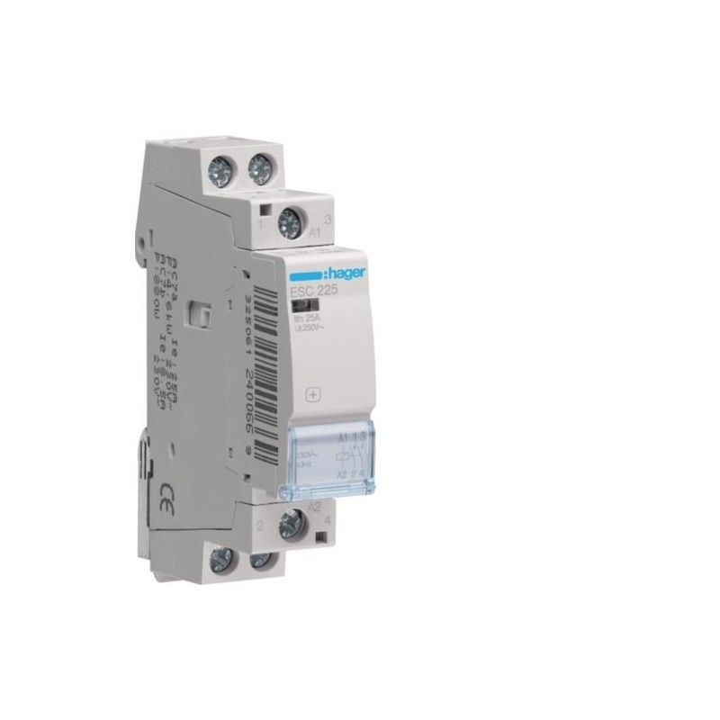 Contactor modular HAGER (Serie ESC) con 2 contactos NA y bobina 230V. Control robusto para cargas de potencia. Disponible en 25A, 40A y 63A.