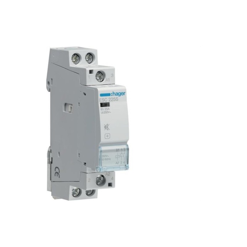 Contactor modular silencioso HAGER (Serie ESC...S) de 2NA con bobina 230V. Ideal para entornos residenciales y de oficina. Disponible en 25A y 40A.