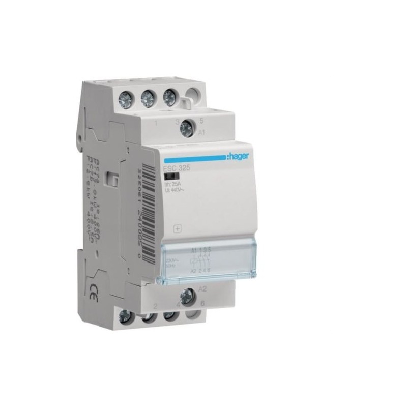 Contactor modular tripolar HAGER (Serie ESC) con 3 contactos Normalmente Abiertos (3NA) y bobina 230V. Ideal para el control de cargas trifásicas. Disponible en intensidades de 25A y 40A.