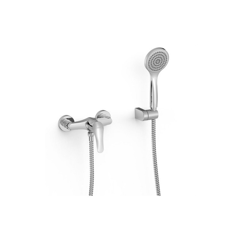 Monomando mural para ducha TRES 21616710. Incluye ducha de mano anticalcárea y flexo metálico.