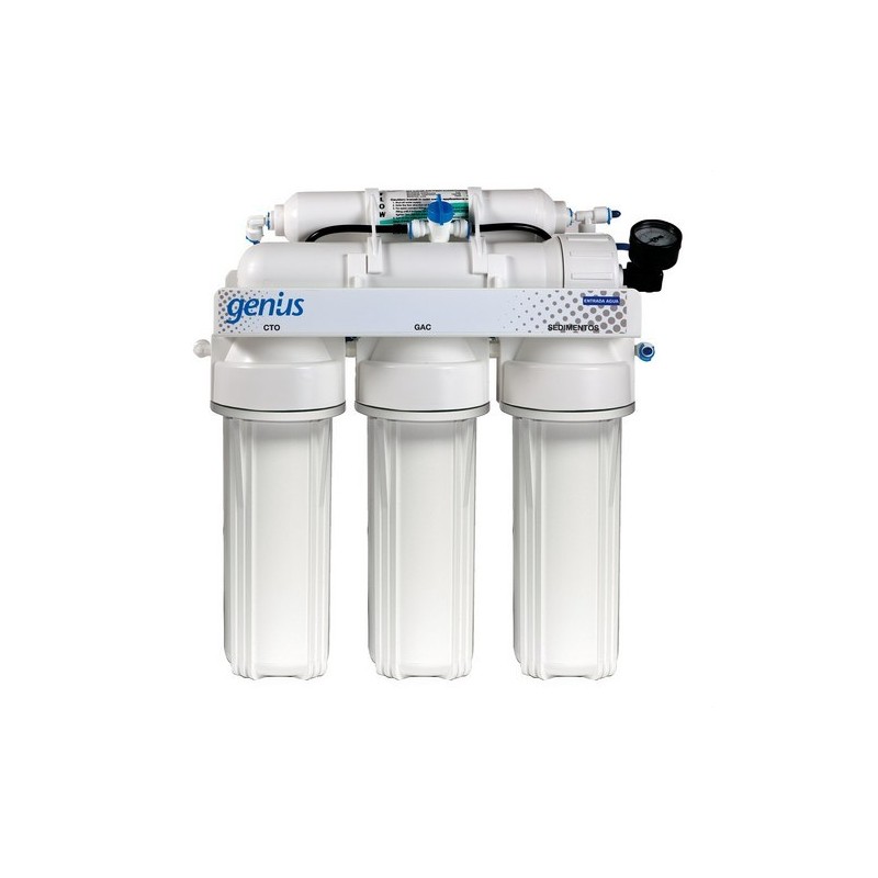 Equipo de ósmosis inversa GENIUS con 4 etapas de filtración y membrana de 75 GPD. Producción de agua pura con bajo contenido en sales.