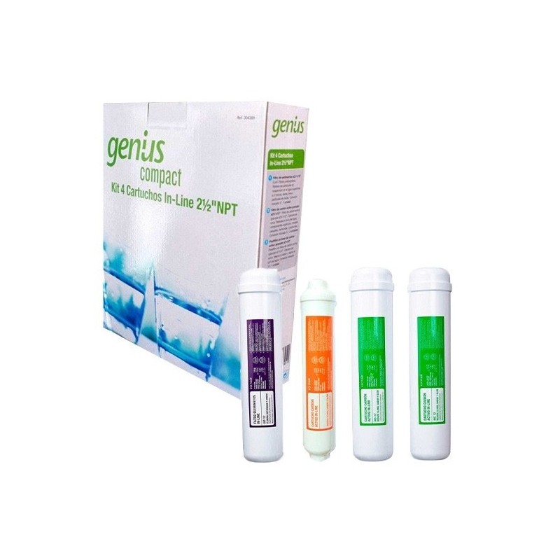 Kit de 4 cartuchos de reemplazo In-Line de acceso rápido, diseñados exclusivamente para el modelo Genius Compact. Estos cartuchos encapsulados garantizan la higiene y facilitan el mantenimiento del sistema de ósmosis inversa doméstica.