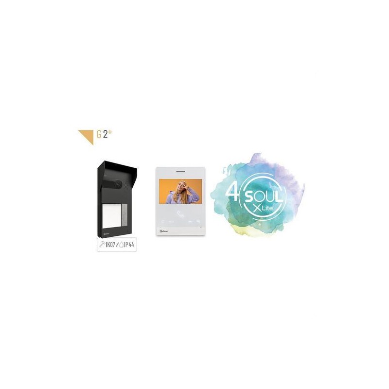 Kit de videoportero G2+ con placa Soul-4.3/LITE antivandálica, monitor ART 4 XLITE de 4.3", alimentación FA-G2+/LITE y funciones de comunicación secreta, vídeo-espía e intercomunicación selectiva.