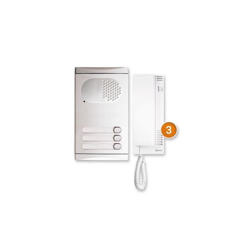 Kit de portero analógico 4+n con placa de tres pulsadores, teléfonos Tekna T-500 y transformador TF-104 para tres viviendas.
