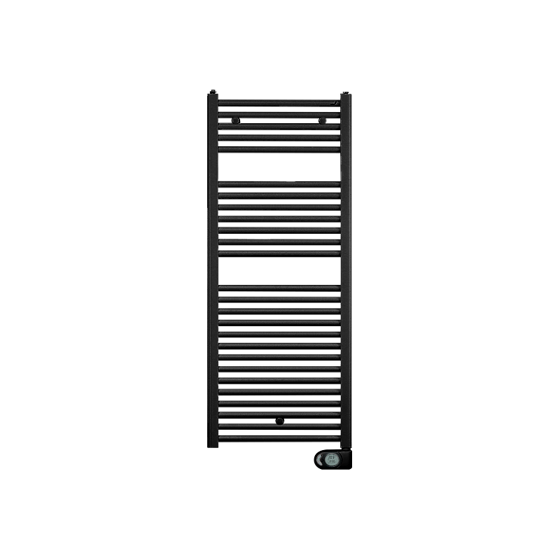 El toallero eléctrico Zehnder Aura PBEBZ-120-50/MQ de 750W es una potente fuente de calor para baños grandes. Su acabado negro mate y su altura de 1300x500mm lo convierten en un elemento decorativo de gran impacto.